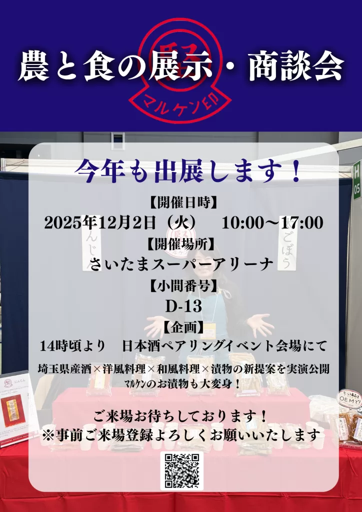 2025年11月25日 / 最終更新日時 : 2026年1月5日 aks1948.com 未分類 第18回 農と食の展示・商談会出展いたします!! 今年で3回目の出展です! 今回は、新作ギフトセットを初お披露目。 さらに、当店自慢の全商品ご試食いただける特別ブースをご用意しております。 皆様のお越しをお待ちしております!! 第18回 農と食の展示・商談会 コメントを残す コメントをキャンセルメールアドレスが公開されることはありません。 ※ が付いている欄は必須項目ですコメント ※ 名前 ※ メール ※ サイト 次回のコメントで使用するためブラウザーに自分の名前、メールアドレス、サイトを保存する。